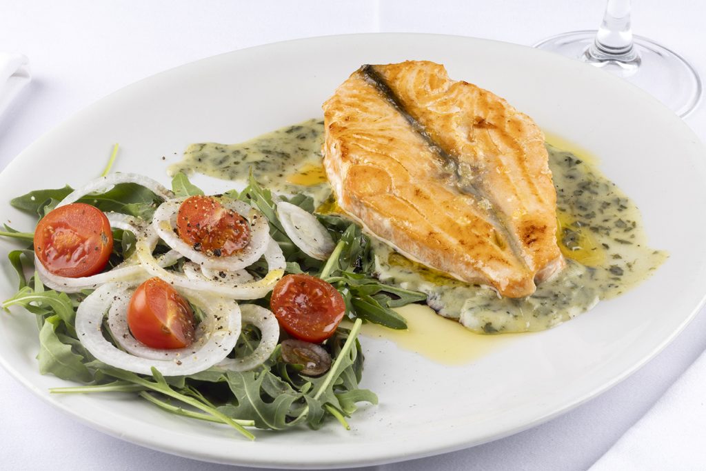 Roasted Norwegian salmon with spinach cream, arugula and cherry tomato salad